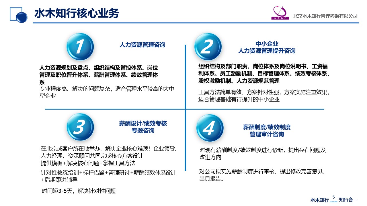 北京水木知行管理咨詢有限公司(www.bjsmzx_com.ttprr.cn)專注提供人力資源管理咨詢、人力資源管理培訓、人力資源招聘咨詢、人力資源獵頭服務業務;咨詢業務范圍包括組織結構與管控體系、崗位管理體系、薪酬管理體系、績效管理體系,咨詢形式包括全過程咨詢、教練式咨詢和特訓班;培訓業務包括企業基礎管理...[詳情]